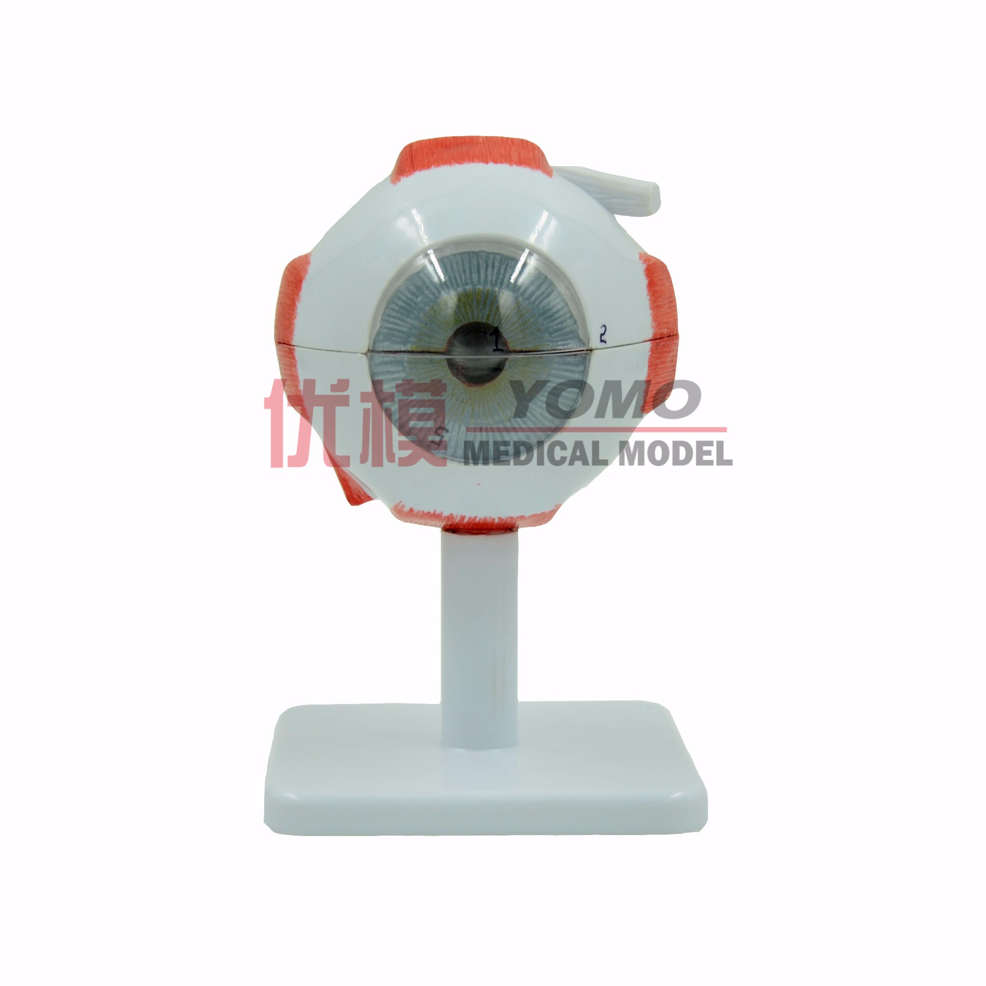 此模型為眼球模型,3倍大,6部件,此眼球模型正中矢狀切,出示了眼球詳細的內部結構。角膜,虹膜,晶狀體,玻璃體可自由拆裝,其中鞏膜上的肌肉附著和部分脈絡膜也可以觀察到。