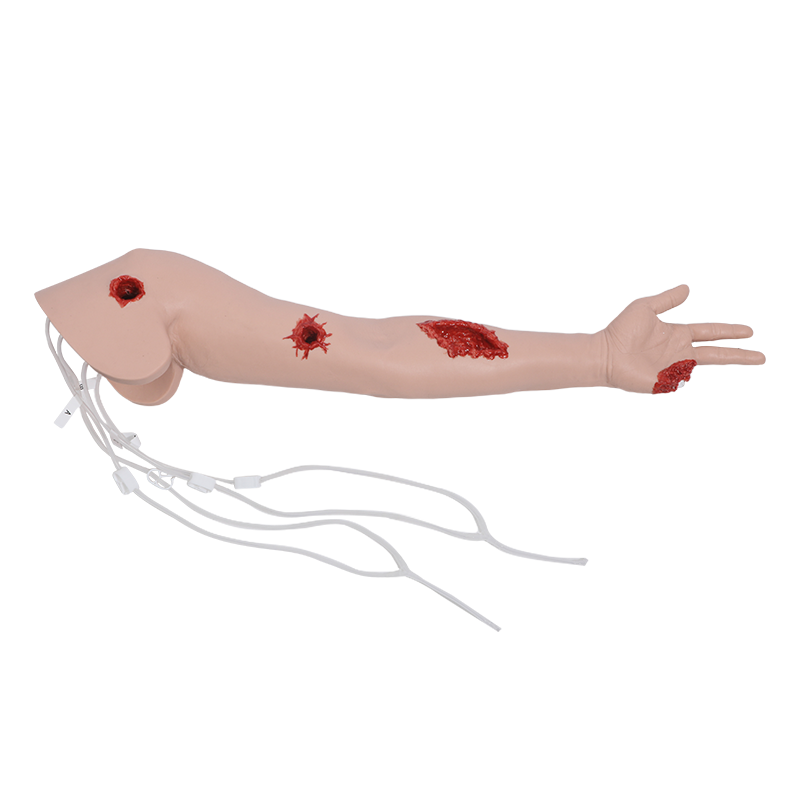 這是一款專為醫療培訓、急救演練設計的仿真手臂模型,高度模擬真實創傷場景,適用于止血技術練習、傷口處理教學等專業領域。產品可模擬槍傷、刀傷、撕裂傷等多種傷口類型,并支持模擬出血功能,提升訓練的真實性。