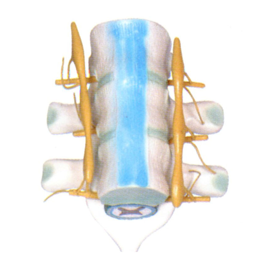 模型上段,脊髓游離,說明包在外面的三層不同厚薄的脊髓膜,即硬脊膜,珠網膜和軟脊膜,并剖示被膜層次,顯示脊神經的根部。